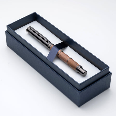 The Revolution Rustic Fountain Pen is crafted with precision techniques and raw materials that pay homage to Tom Hessin’s industrial past. The warm walnut barrel is offset by cool metal accents, a study in contrast that captures the spirit of innovation.
