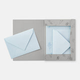 The stationery is made of blue-dyed Japanese washi paper. The cards and envelopes come with a decorative folder that will allow you to safely store the set.