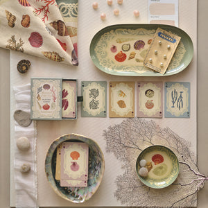 Add a touch of coastal curiosity to your home with this oval-shaped Specimens of the Sea Enamel Tray. The elegant design features detailed sea specimens sourced from 18th-century natural history books, capturing the wonder and fine detail of early scientific exploration. The shell and marine creatures are surrounded by a delicate lace frame, creating a refined, vintage-inspired composition that brings a quietly nautical charm to any space.