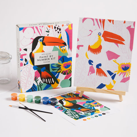 The Kitty McCall Toucan Paint By Number Kit from Galison includes line-drawing floral art on canvas from Nigerian-born, UK-based artist, Kitty McCall. This paint by numbers piece is designed for anyone to replicate McCall’s stunning artwork. Influenced by the natural world around her, along with the vibrant landscape of her early childhood in Nigeria, Kitty McCall has developed a signature style of bold colors, overlaid patterns, and shapes to create geometric designs and floral landscapes for interiors, and accessories.
