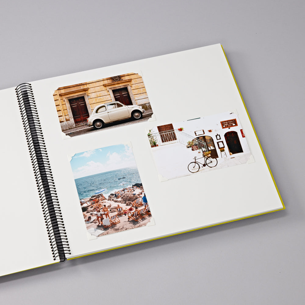 Thanks to the spiral binding, the photo album can be opened 180° and increases with the laminated pages. The pages lie completely flat when the album is opened.