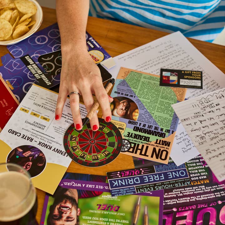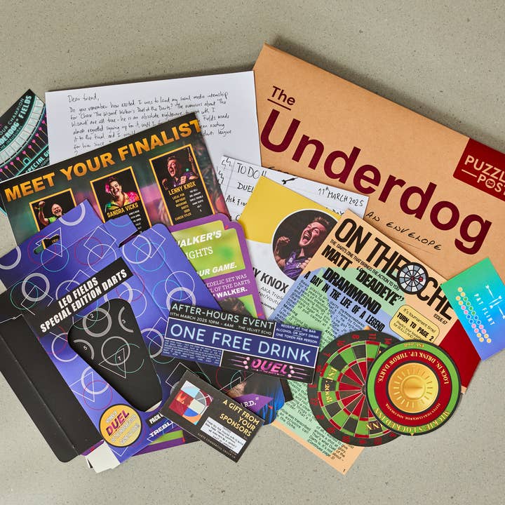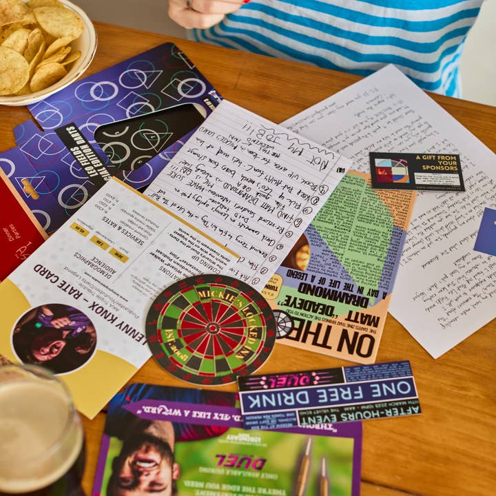 Duel of the Darts, amateurs and professionals alike have been competing for the ultimate prize. Did Leo, the lovable underdog, really win big? You must solve the puzzles to find out if it is actually too good to be true! The Dinner Party Range - Ages 14+, and for groups of 2-8. - Plastic free, fully recyclable, sustainably sourced materials. Puzzle Post We are a UK games company founded in 2020. We're woman-owned, eco-friendly and proudly independent - we want people to enjoy playing our games as much as we enjoy making them!