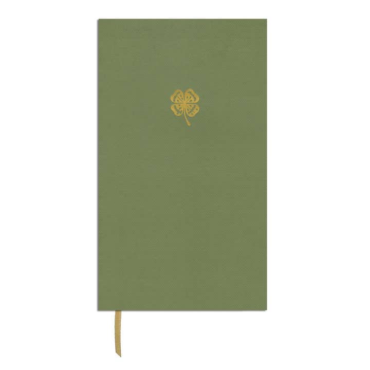 Designed for everyday thoughts and quick ideas, this slim, lightweight notebook features a textured green cover with a gold-foil debossed clover icon, gilded edging, and a satin ribbon marker for an elevated finish. Inside, smooth ivory-lined pages make writing feel effortless, while the inside cover reveals a vintage green pattern paired with the phrase “Fortune Favours the Brave.” With 40 pages (80 sides), it’s the perfect size to slip into a bag or pair with our 24k gold-plated pens—a refined companion for notes, lists, or moments of inspiration.